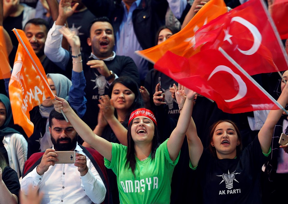 Cumhurbaşkanı Erdoğan ve eşi Emine Erdoğan, hazırlanan platformdan yürüyerek partilileri selamlarken, partililer hep birlikte "Dönmem geri senin yolundan" şarkısını söyledi.