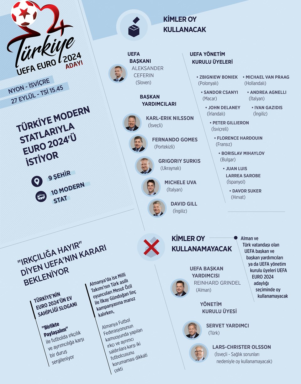 UEFA başkan ve yardımcıları ile UEFA yönetim kurulu üyeleri, Türkiye ile Almanya arasında bir seçim yaparak EURO 2024'ün ev sahibini belirleyecek.