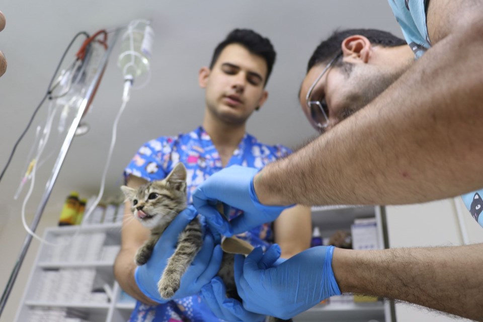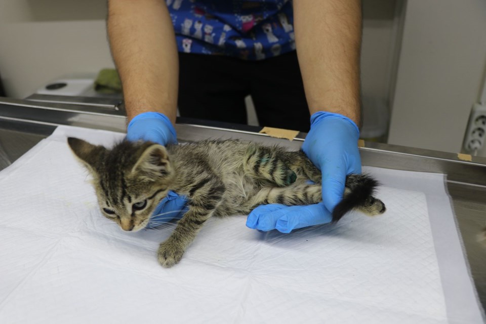 Gazi Osman Paşa Mahallesi'nde dere kenarında oynayan çocuklar, arka ayaklarından biri kesilmiş iki kedi yavrusu gördü. Durumdan haberdar olan çevre sakinlerinden Emirhan Kuzu, yaralı kedileri tedavi için veteriner hekim Bektaş Aksu'ya götürdü.
